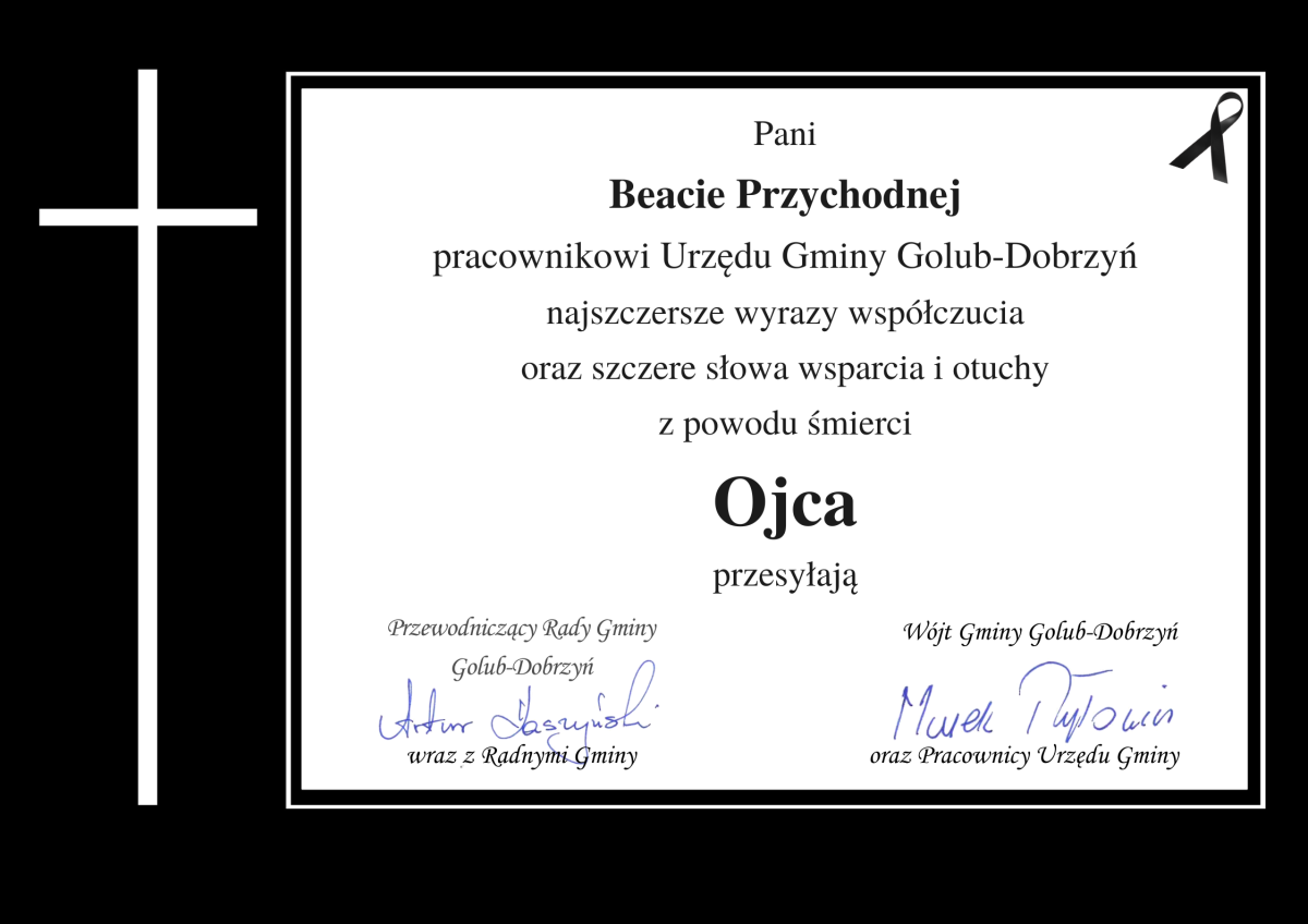 Pani Beacie Przychodnej, pracownikowi Urzędu Gminy Golub-Dobrzyń składamy najszczersze wyrazy współczucia oraz szczere słowa wsparcia i otuchy z powodu śmierci Ojca.