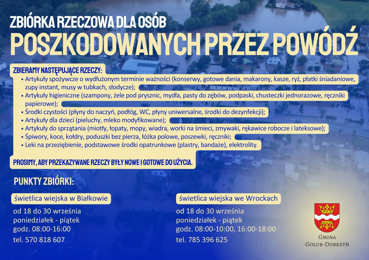 W związku z tragedią, jaka dotknęła południe Polski, Gmina Golub-Dobrzyń i Centrum Usług Społecznych w Gminie Golub-Dobrzyń ogłaszają zbiórkę rzeczową dla osób poszkodowanych przez powódź. Od 18 września aż do końca miesiąca, od poniedziałku do piątku, zapraszamy do punktów zbiórki: