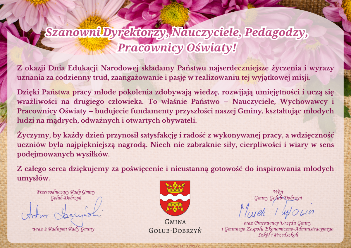 Z okazji Dnia Edukacji Narodowej składamy Państwu najserdeczniejsze życzenia i wyrazy uznania za codzienny trud, zaangażowanie i pasję w realizowaniu tej wyjątkowej misji.